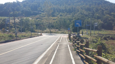 I left the Jeok Gyo Jang Motel at exactly 5:45 a.m. today, which meant walking in darkness for the better part of an hour before the sun began to peek over the eastern horizon. It was cold out, but I didn't put on my jacket. My fingers were frozen as a result; I tucked my left hand into my pants pocket to warm my poor digits. My right hand, the one holding the trekking pole, had to fend for itself. The morning was shrouded in fog or mist, and it soon became obvious that the mist wasn't leaving without a fight. It took until almost 9 a.m., but the sun eventually won out.