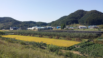 The eighth day and the seventh leg of this walk saw me go another shortish stretch: just 22 km from Jangsu Pension to the bizarrely named On You Hotel in the northern part of Choongju City, a city so large that I'll need four days to pass through it. I'm here for only one night, but when I reach the middle of the city, I'll be staying for two nights in one of my favorite, hilariously tacky yeogwans, the kind with the red mood lighting and the vibrating beds. I always enjoy the chintz factor when I'm there; it makes me wonder if this is what Graceland is like.